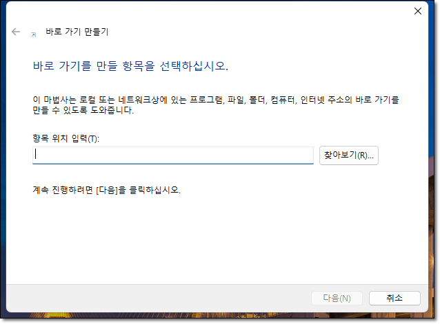 이제 바로가기를 만들기 위한 창이 열립니다.
