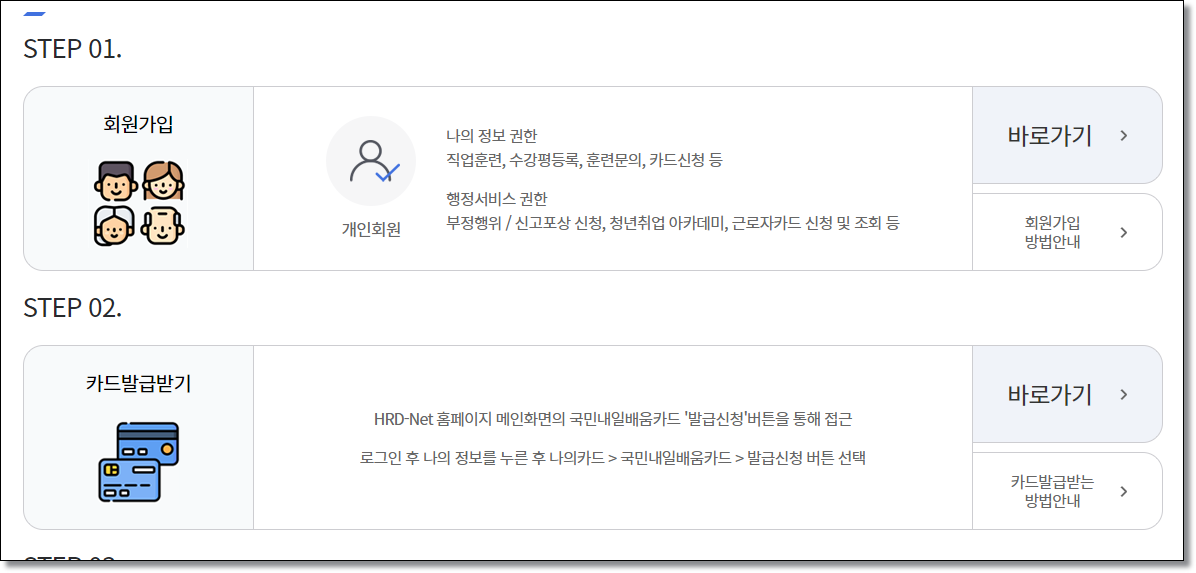 - 내일배움카드는 HRD-NET 웹사이트를 통해 신청할 수 있습니다. 웹사이트에 접속하여 회원가입 후 로그인을 하면 카드 신청이 가능합니다. ONE-ID를 통한 가입을 권장하며, 이는 취업 및 이직을 위한 워크넷 이용에도 유용합니다.