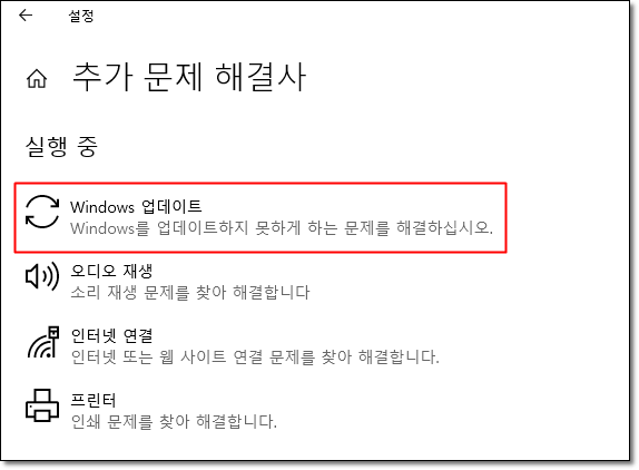 - '추가 문제 해결사'를 클릭하고, 목록에서 'Windows 업데이트'를 찾습니다.