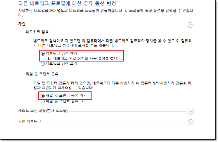 - 개인을 클릭한 후, 네트워크 검색 켜기와 파일 및 프린터 공유 켜기를 체크합니다.