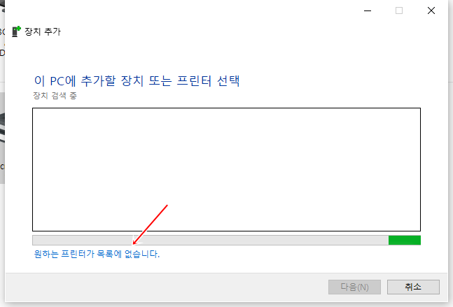 - 같은 공유기에 랜선이 연결되어 있다면 자동으로 공유 프린터를 검색할 수 있습니다. 만약 공유 프린터가 검색되지 않는다면 "원하는 목록이 없습니다"를 클릭하면 다른 방법을 선택할 수 있습니다.