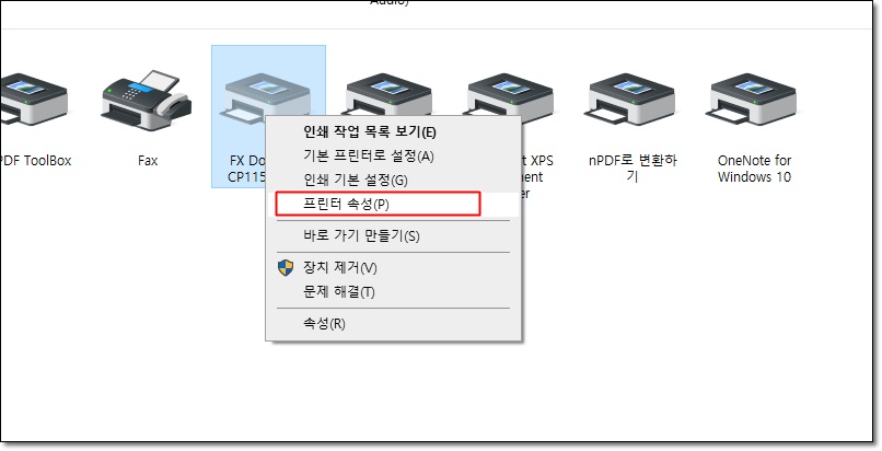 - 메인 컴퓨터의 프린터를 선택한 다음, 마우스 오른쪽 버튼을 클릭하고, 프린터 속성을 선택합니다.