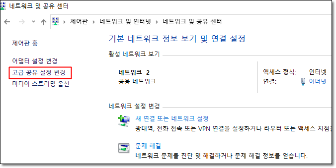 - 제어판으로 이동을 하시면 네트워크 상태 및 작업보기 > 고급공유설정 변경을 선택합니다.